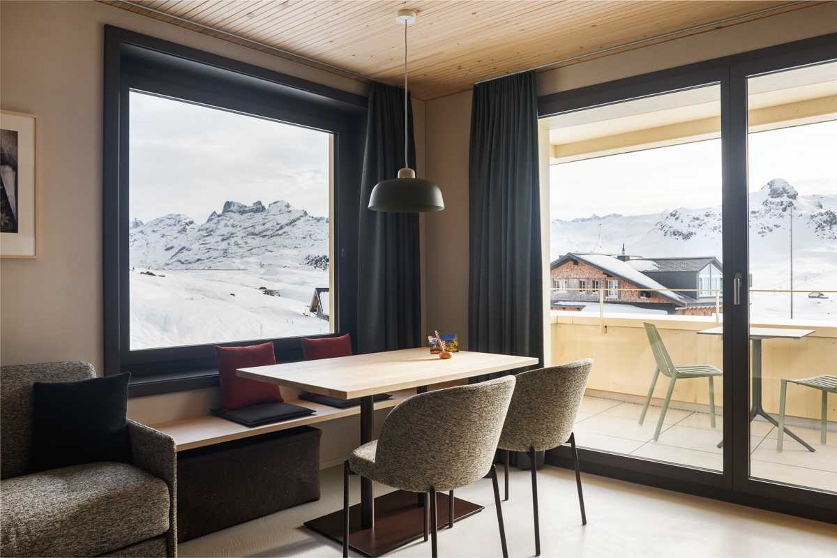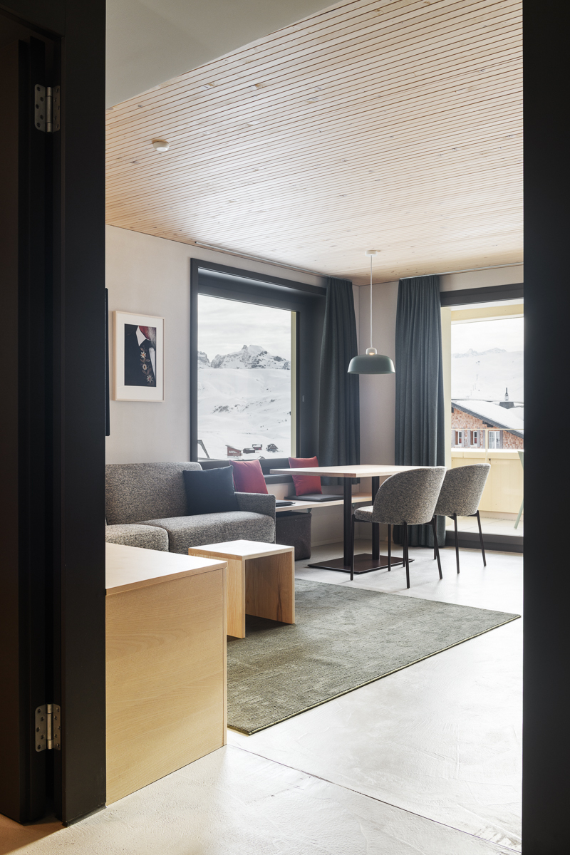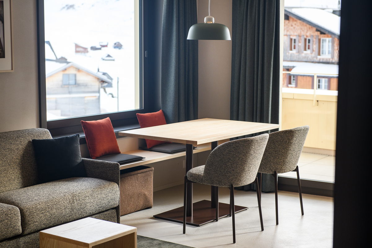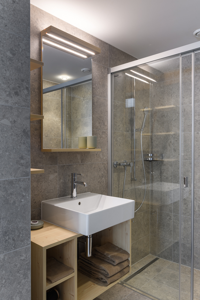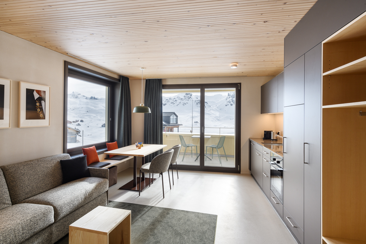 Die 2.5 Zimmer Apartments sind optimal eingerichtet für 2 bis max. 4 Personen und verfügen über ein Schlafzimmer mit trennbarem Doppelbett, ein Badezimmer mit Dusche/Waschbecken und separatem WC. Der Wohn- und Essbereich bietet eine vollausgestattete Küche, ein Bettsofa und einen Balkon